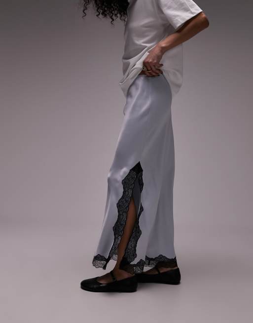 Topshop lace trim satin bias midi skirt in icy blue with black lace