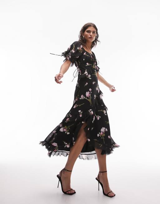 Topshop lace up back occasion dress with raw seams in dark floral