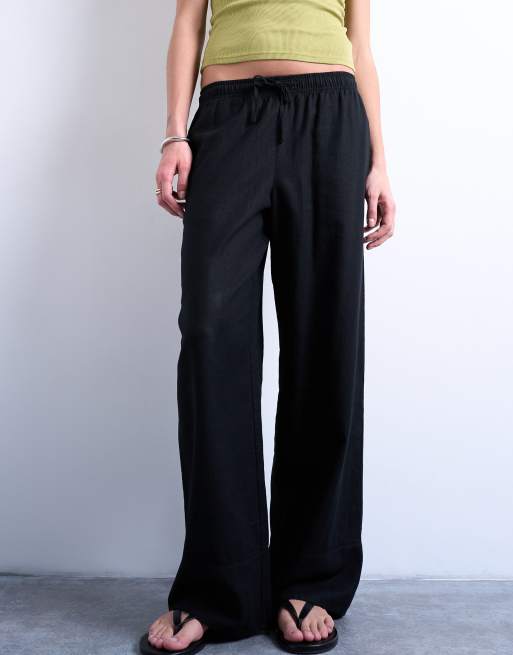 Topshop linen blend straight leg pants with deep cuffs in black
