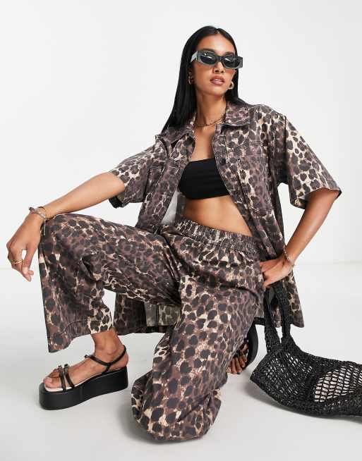 Topshop mid rise pull on lightweight leopard print wide leg pants in Brown - part of a set