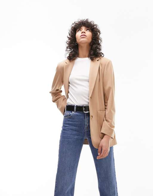 Topshop premium jersey straight blazer in camel