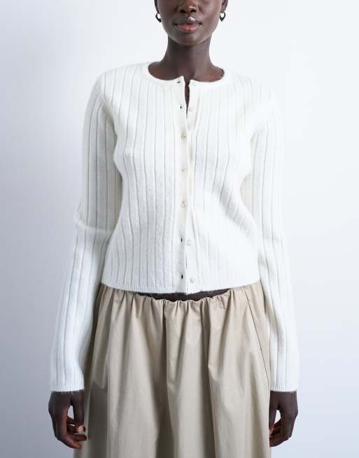 Topshop rib knit button crew neck cardigan in white