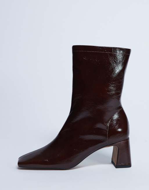 Topshop Sara Premium leather square toe flared heel boots in chocolate