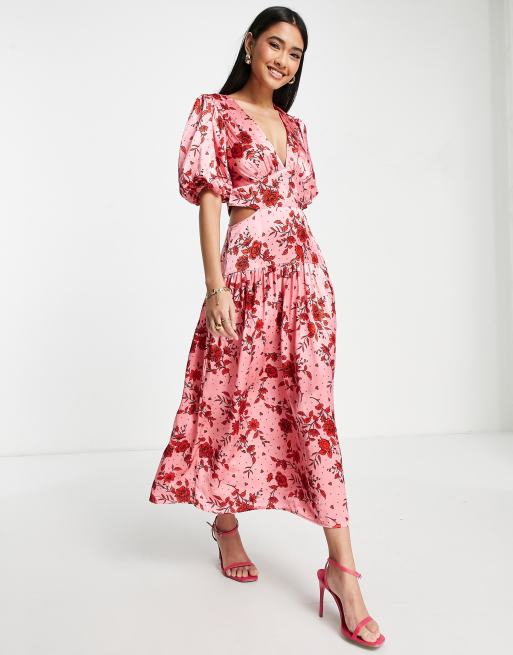 Topshop satin floral cut out occasion midi dress in pink