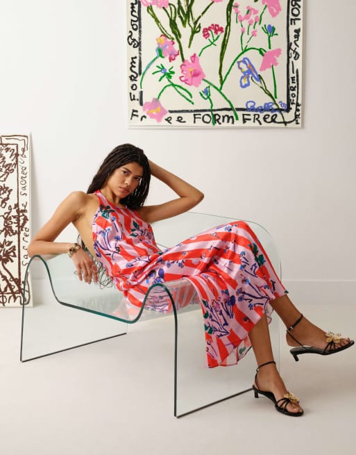 Topshop satin halterneck dress in pink and red bradley stripes