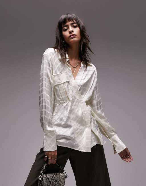Topshop self plaid satin shirt in ivory