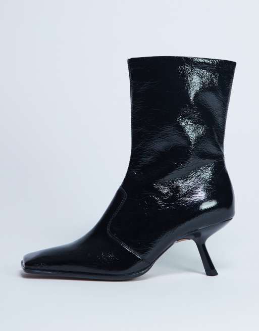 Topshop Sienna Premium leather square toe mid heel boots in black