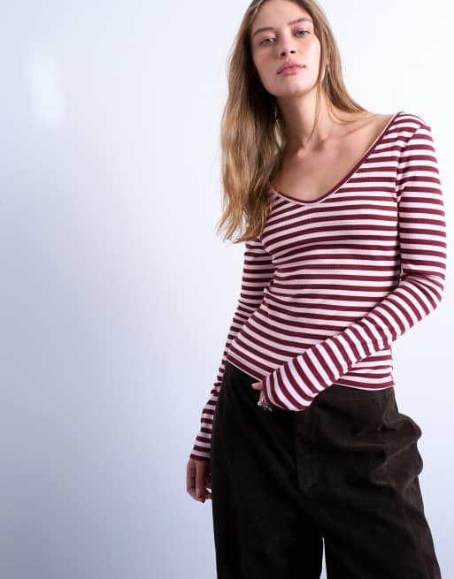 Topshop striped v-neck top in pink and burgundy