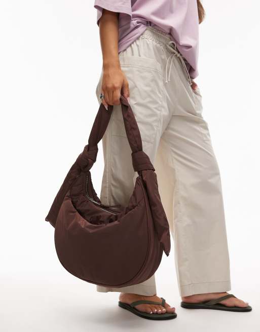 Topshop Terry nylon zip pocket shoulder bag in chocolate
