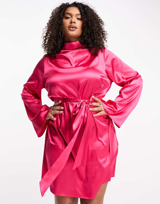 Urban Threads Curve satin high neck waist tie mini dress in fuschia