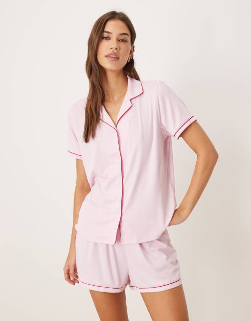 Urban Threads ribbed camp collar shorts pajama set in pink with red piping
