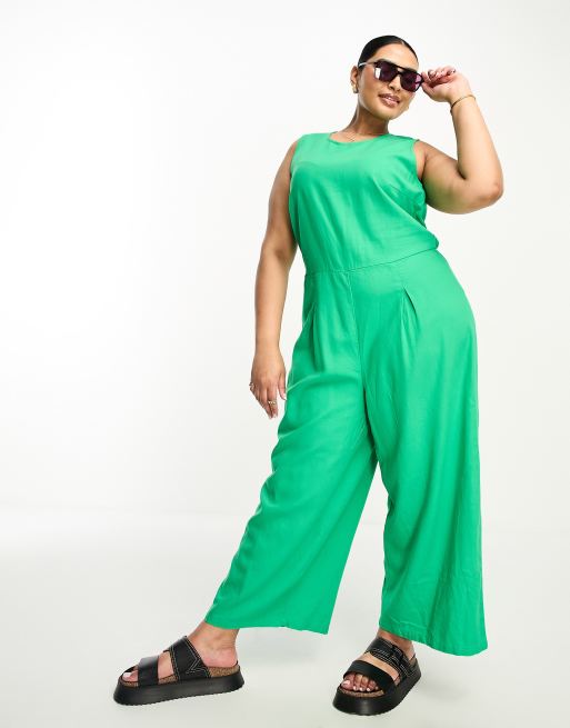 Vero Moda Curve linen touch tie back jumpsuit with pleat front wide leg in green