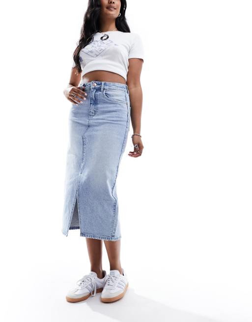 Vero Moda denim midaxi skirt with front split in light blue