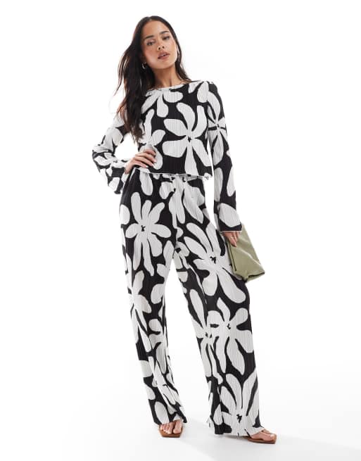 Vero Moda high waist wide leg plisse pants in black and white floral print - part of a set