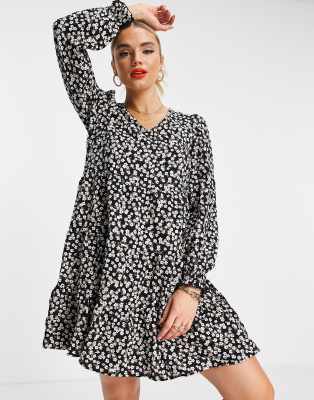 Vero Moda polyester mini smock dress in black & white floral