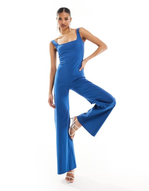 Vesper bengaline square neck wide leg jumpsuit in blue