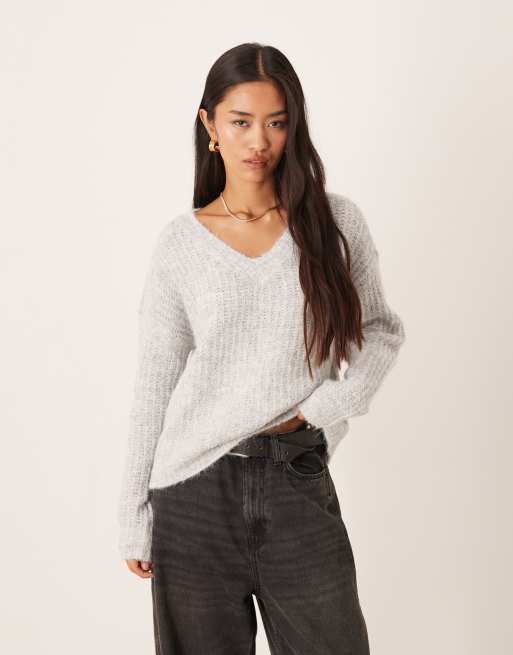 VILA fluffy knitted v neck oversized sweater in medium gray melange