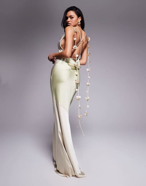 Wanderdoll Aria satin cowl neck draped flower detail cross back maxi dress in sage and cream