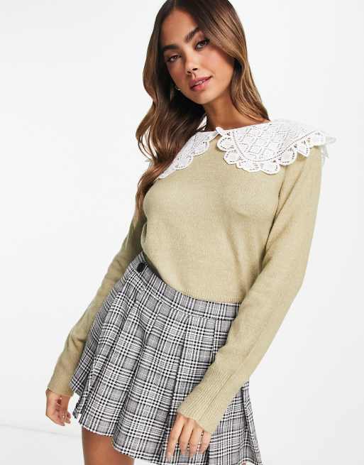 Wednesday's Girl cropped sweaters in taupe with oversized lace collar