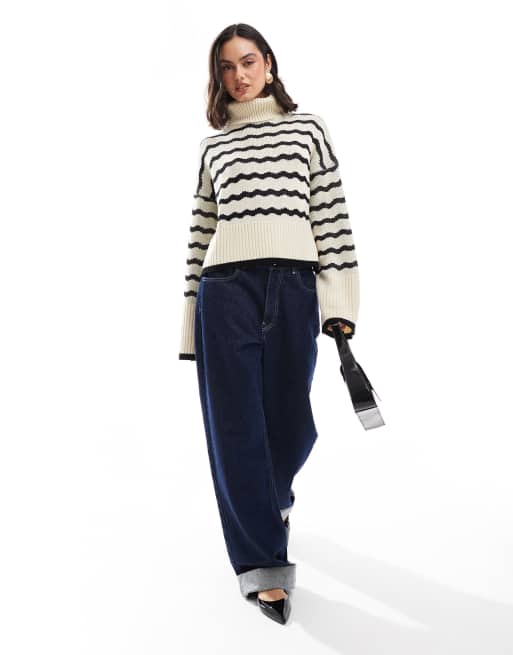 Wednesday's Girl funnel neck zig-zag stripe sweater in cream and black