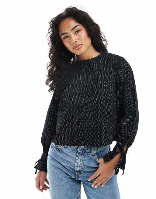 Wednesday's Girl micro dot corduroy collar detail blouse in black