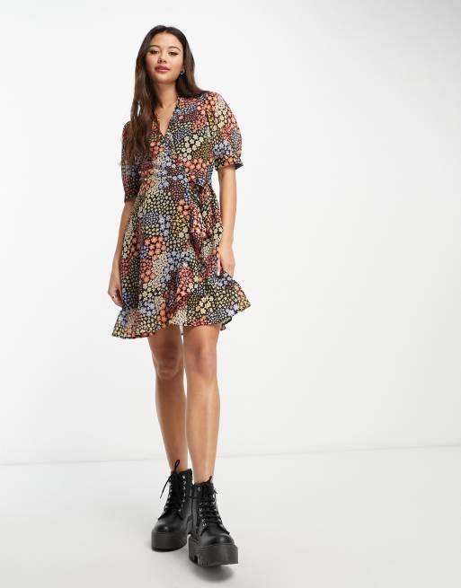 Wednesday's Girl ruffle detail mini tea dress in patchwork floral