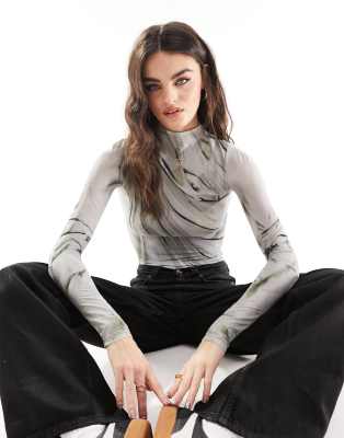 Weekday high neck mesh top in gray abstract print