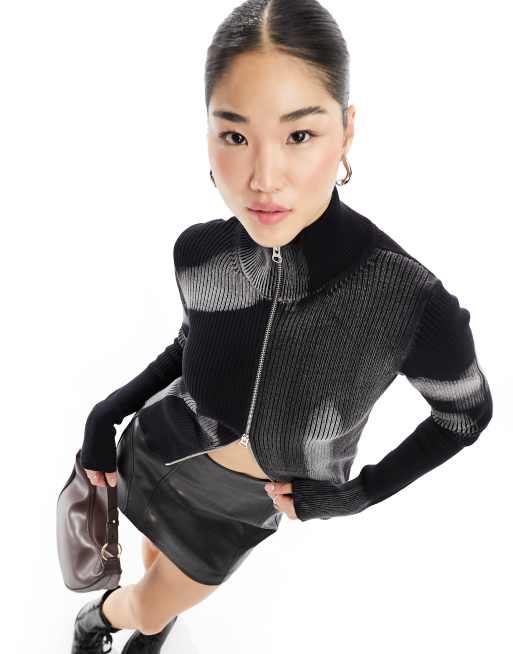 Weekday Taiki tight fit zip through cardigan in black & white jacquard