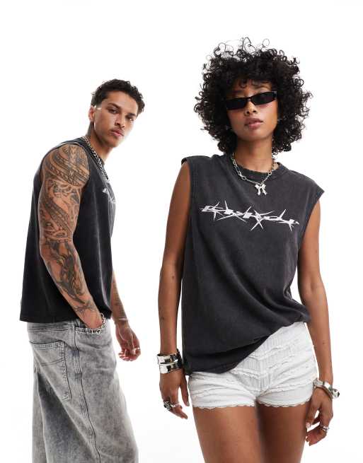Weekday Unisex boxy tank top with barbed wire text graphic print in black exclusive to ASOS
