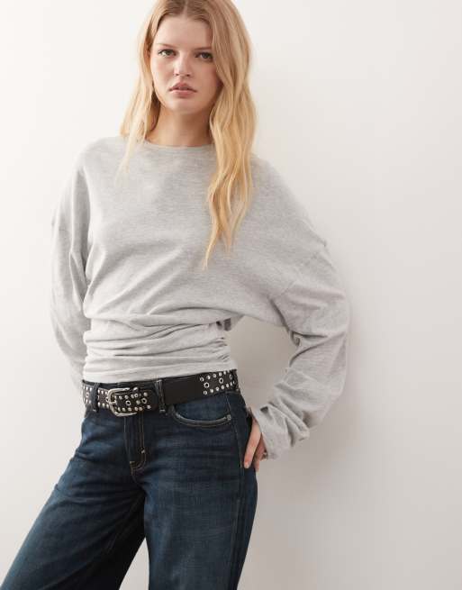 Weekday volume long sleeve top with cinched gathered waist in gray melange