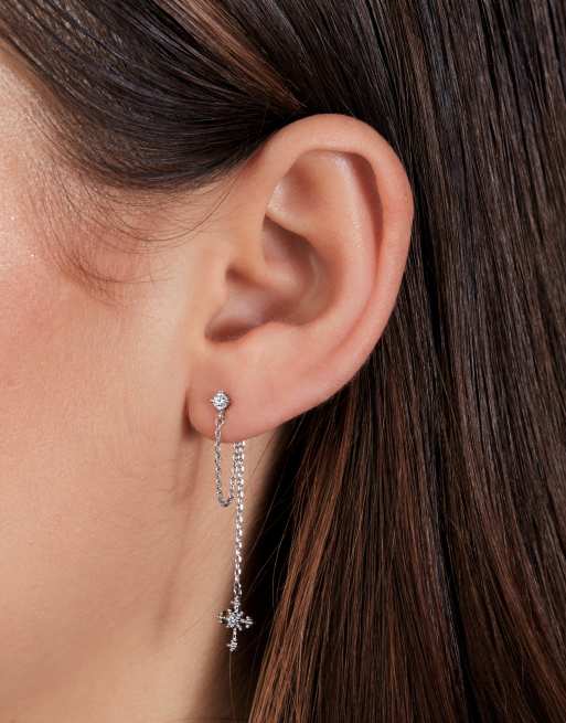 With Bling Exclusive crystal cross & chain barbell earring in silver plate