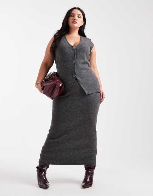 " Vero Moda Curve soft knitted waistcoat and midi skirt co-ord in grey melange"