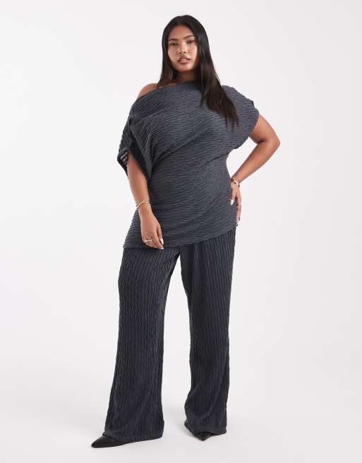 Vero Moda Curve textured jersey off shoulder top and wide leg trouser co-ord in grey