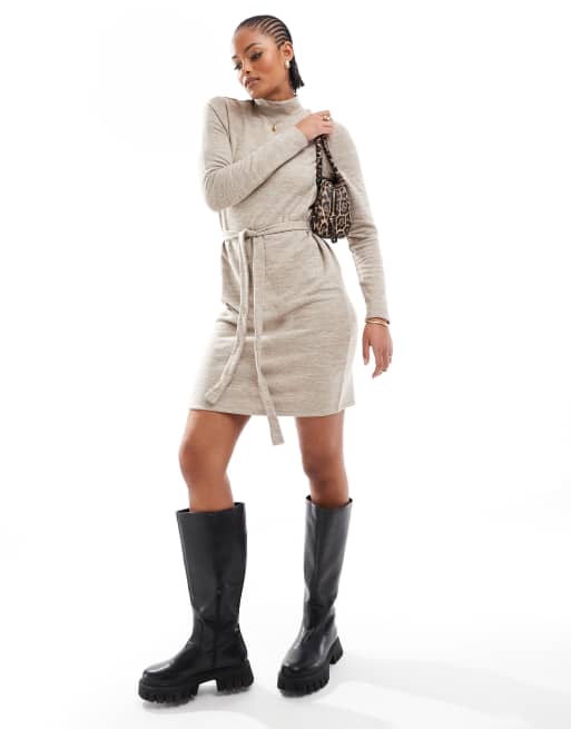 Vero Moda Tall high neck knitted mini dress with tie waist in stone