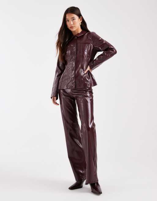 Vero Moda cinched waist vinyl jacket and high waist trouser set in burgundy