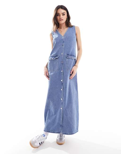 Vero Moda denim sleeveless button through maxi dress in blue
