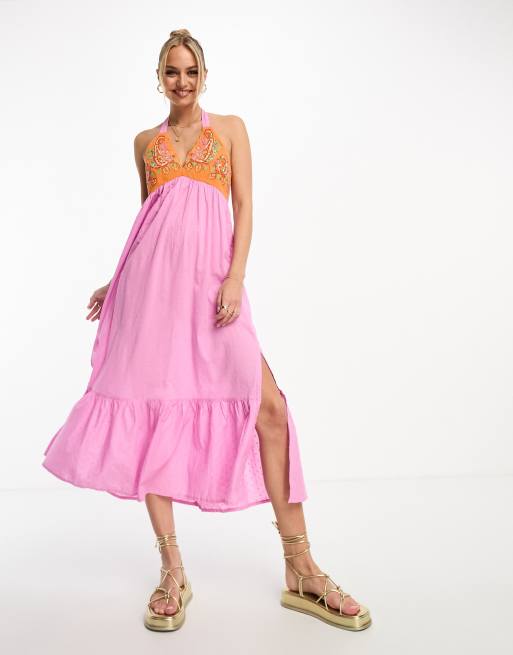 Vero Moda embroidered bodice maxi dress in orange and pink