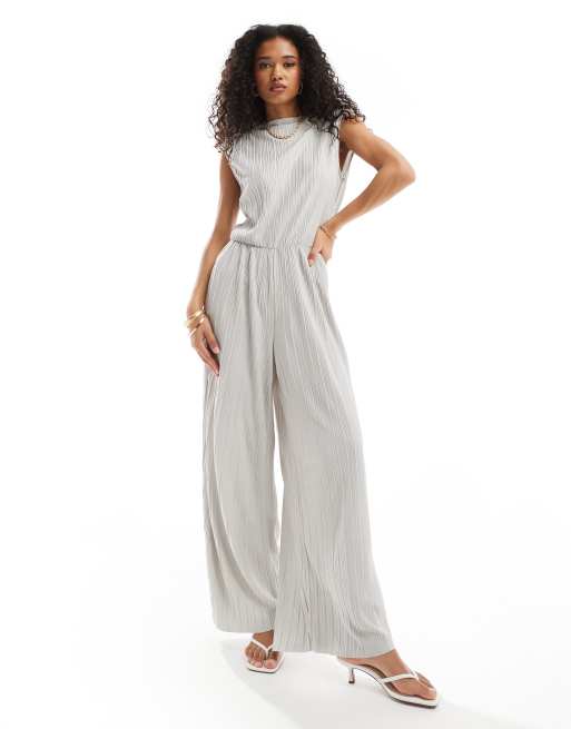 Vero Moda high neck sleeveless plisse jumpsuit in light grey