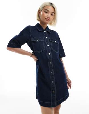 Vero Moda oversized button front short sleeve denim dress in dark blue wash