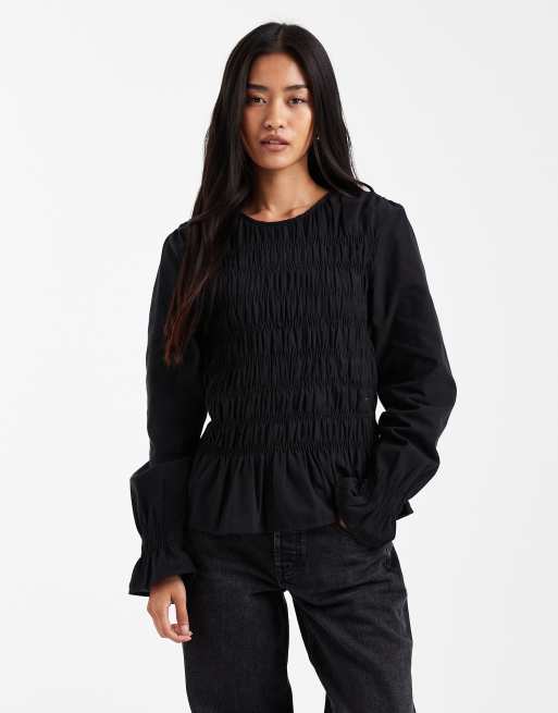 Vero Moda shirred bodice top with poet sleeve in black