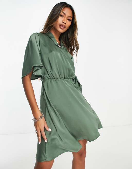 Vero Moda short sleeve satin wrap mini dress in khaki