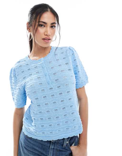 Vero Moda short sleeved crochet top with buttons in light blue