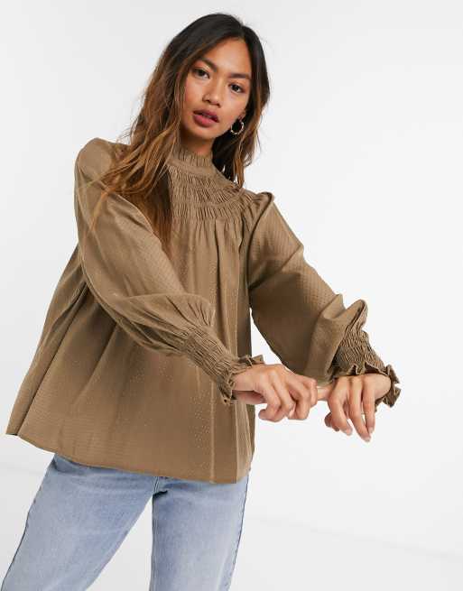Vero Moda smock top with shirred high neck in tan