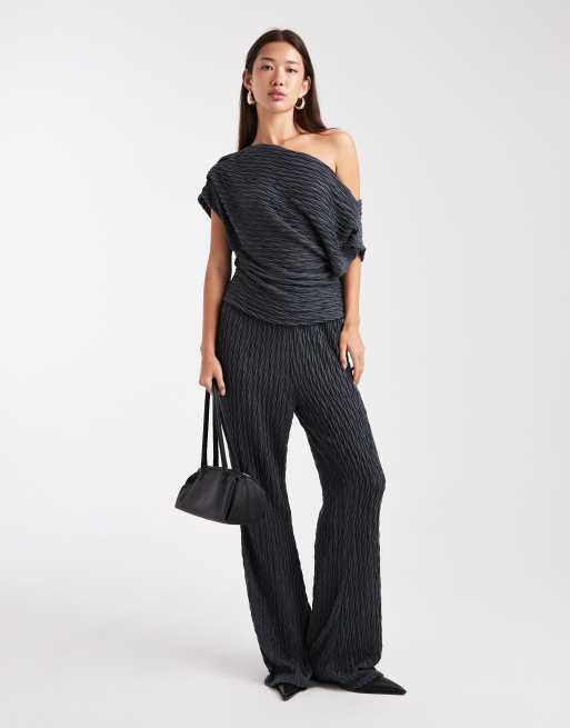 Vero Moda textured jersey off shoulder drapey top and wide leg trouser set in asphalt grey