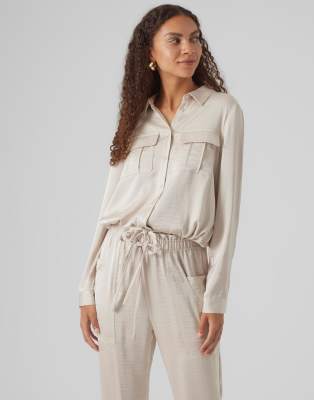 Vero Moda utility shirt co-ord in liquid satin stone