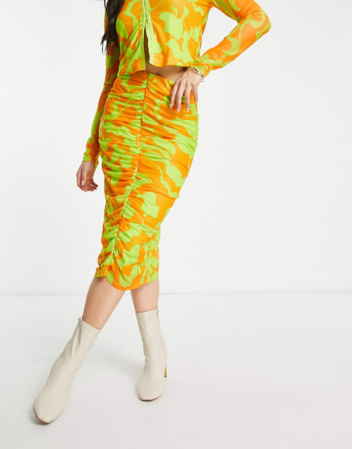 Vero Moda X Joann Van Der Herik mesh ruched midi skirt co-ord in orange and lime