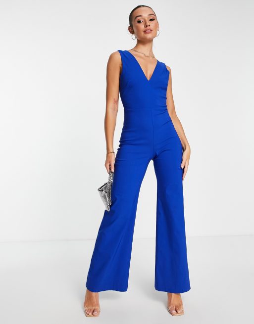 Vesper bengaline plunge front wide leg jumpsuit in cobalt
