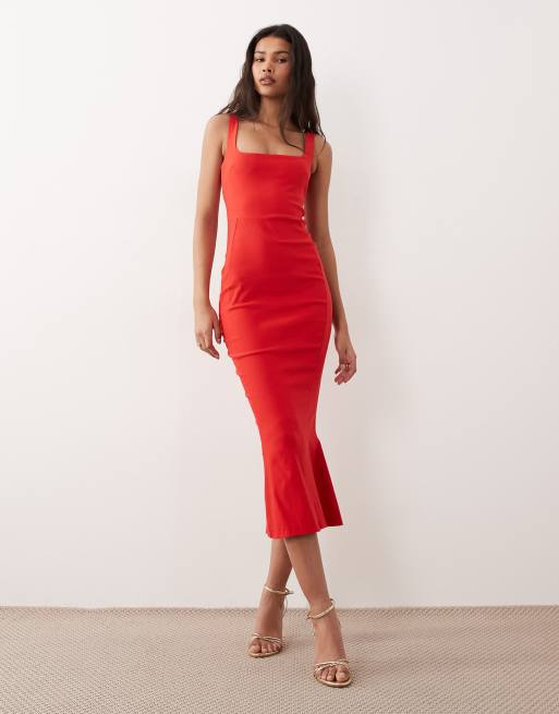 Vesper bengaline sleeveless square neck fishtail midi dress in red