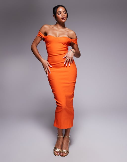 Vesper Off shoulder bardot bodycon midaxi dress in orange