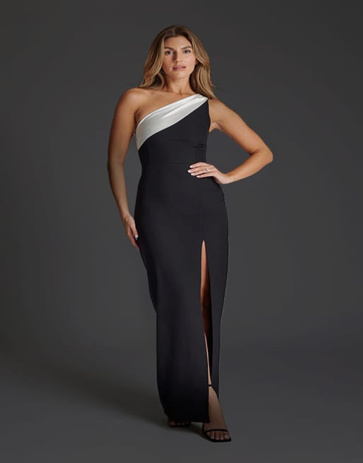 Vesper One shoulder satin contrast maxi dress in monochrome